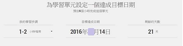 以前都選第一種,想說還有很多天可以完成單元,就常常懶惰沒上課。直到課程所剩時間不多,才改成第三種...。我有個毛病,很害怕:截止日期(deadlines)。單元進度自從改了七天才比較積極上課 還有 暗示自己課程快要結束。如果你也跟我一樣恐懼截止日,或許你在上課的時候可以試試"調短完成天數"這個方法。如果我早一點縮短單元完成日期,也就可以上更多的課程了...嗚嗚嗚...