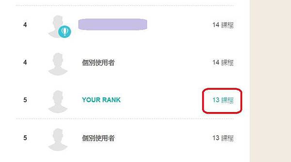 事實證明人就是有惰性、有藉口、每天半小時也不願意.....而且線上課程很吃自己的紀律,沒上或浪費個幾天,首頁的課程排行榜名次就會一直掉,欠的課程就越來越多,離當出(可以上完12級)的目標也越來越遠...。因為認為 教材、課程、影片和資源就擺在那裡等你用不會跑掉,卻也容易陷入"唉唷,還有時間,今天沒上應該不會怎麼樣"的懶惰模式...。而且我又堅持寫作也一定要寫,不寫就不能上新課程(避免自己這次跳過 會養成以後的寫作都跳過),但常常拖過一兩天甚至更久才寫。(...到月底了才上了13個課程...)