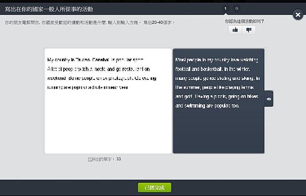 - 寫作時我會去看課程裡的例句,發現換個方式一樣可以表達同一件事,就覺得很酷!不然自己會的句型實在太基礎,常常講不出自己想表達的會長有"書到用時方恨少"無奈。有時候也會參考範例來寫,自己照著範例寫了一篇文章會很有成就感!有時候會要求寫個兩三句來介紹圖片,寫完就能看到其他使用者的寫作,很好玩,可以學習到其他人不同的描述法,當然也看過有人打亂碼來交差了事 或 整欄就只有一個英文單字XD。